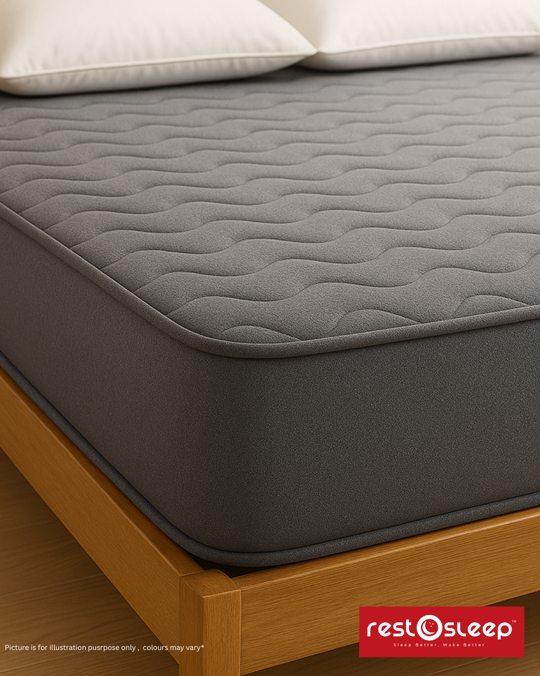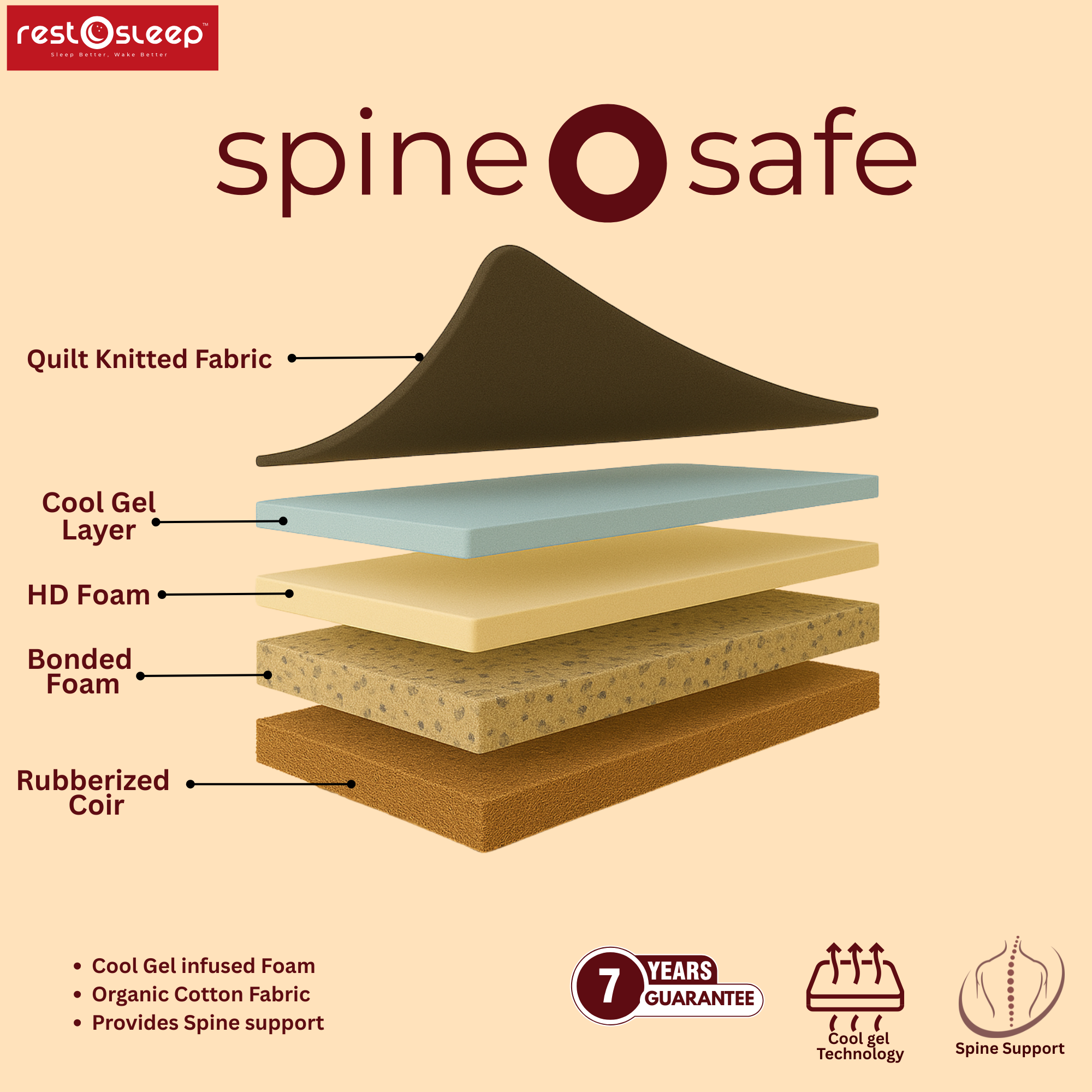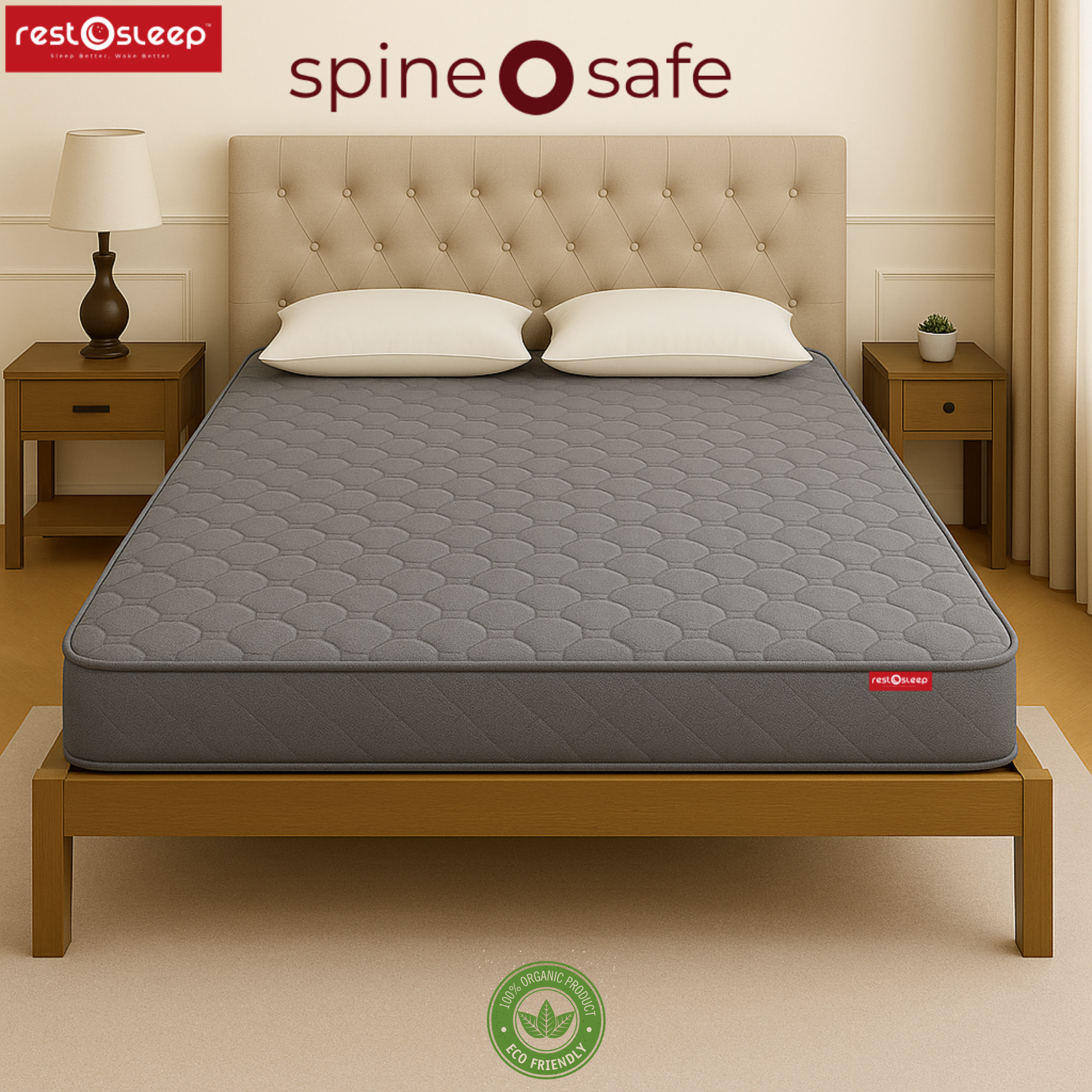 The Spine O Safe Mattress by Restosleep is thoughtfully designed to promote spinal health and overall sleep wellness. Its 5-layer orthopedic build provides targeted support to reduce back pressure while maintaining comfort. The layers include: