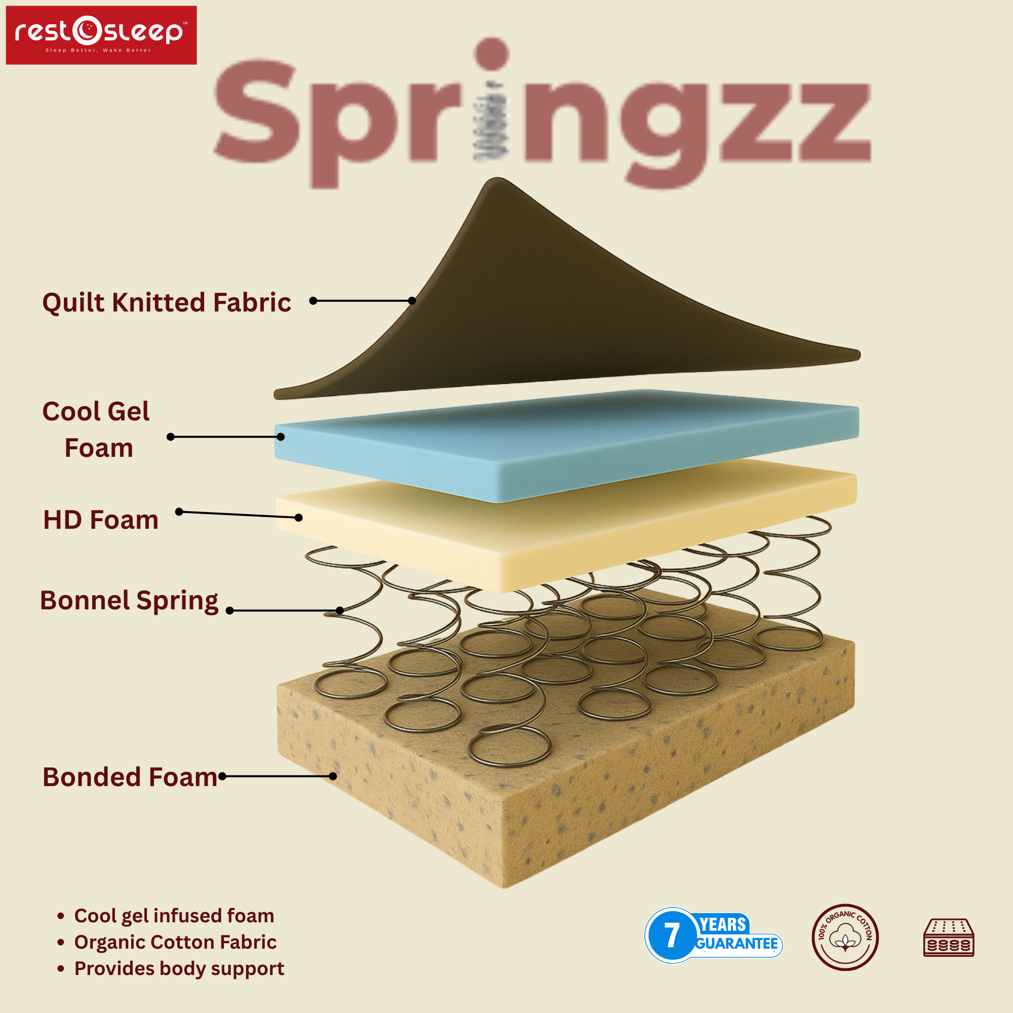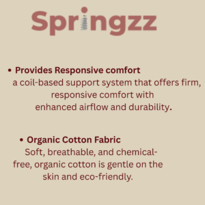 Springzz offers firm, responsive comfort with a Bonnel spring core, cool gel foam, and organic cotton fabric—built for bounce, breathability, and long-lasting support.